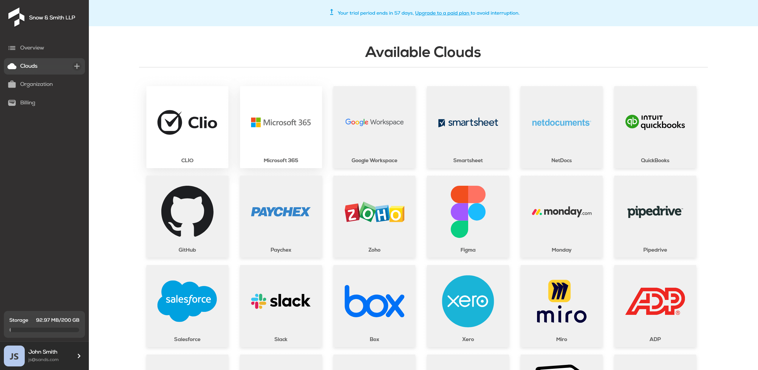 Effortlessly connect your Clio account and set up automated backup workflows in a single click. -