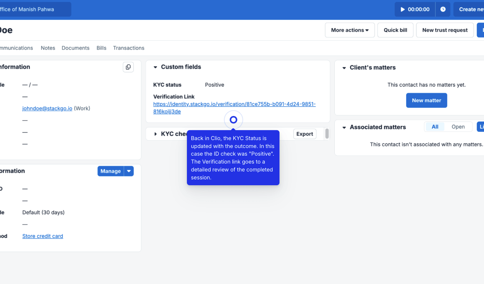 - Create new contacts and matters using secure onboarding forms. Clients receive a secure link via email or SMS and complete biometric ID checks in under 60 seconds, with results, extracted data, and audit-ready compliance records returned to Clio instantly.