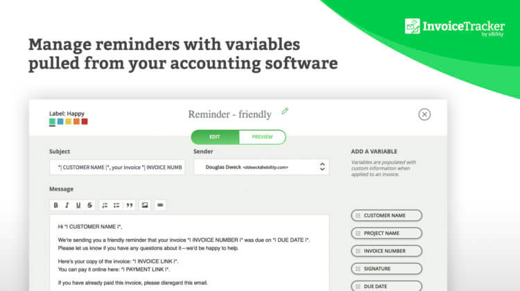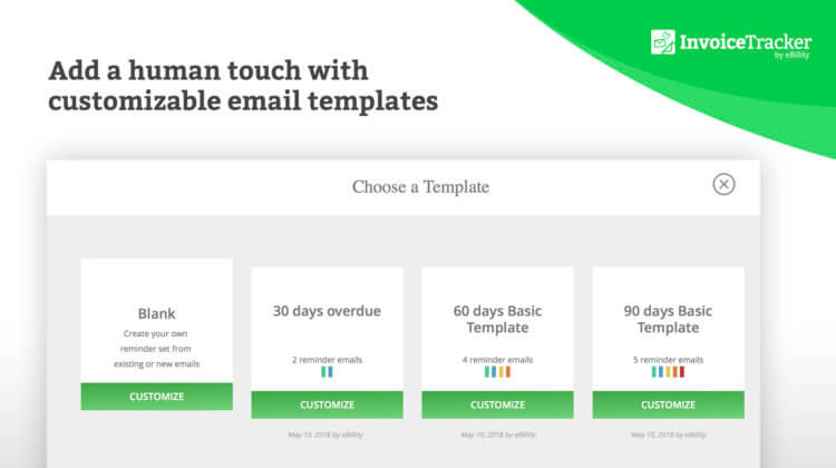Invoice Tracker's customizable email templates allow you to add a human touch to your automated reminders so you can maintain your client relationship with personal and genuine messages.