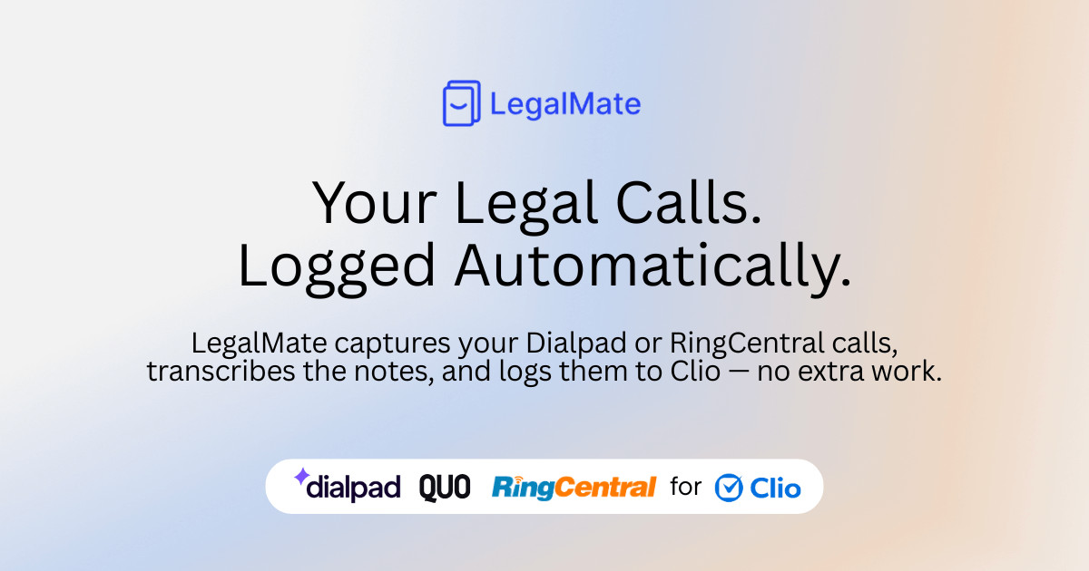 LegalMate Call Sync brings every call from Dialpad, RingCentral, or Quo directly into Clio, automatically generating organized notes, time entries, and tasks tied to the correct Matter.