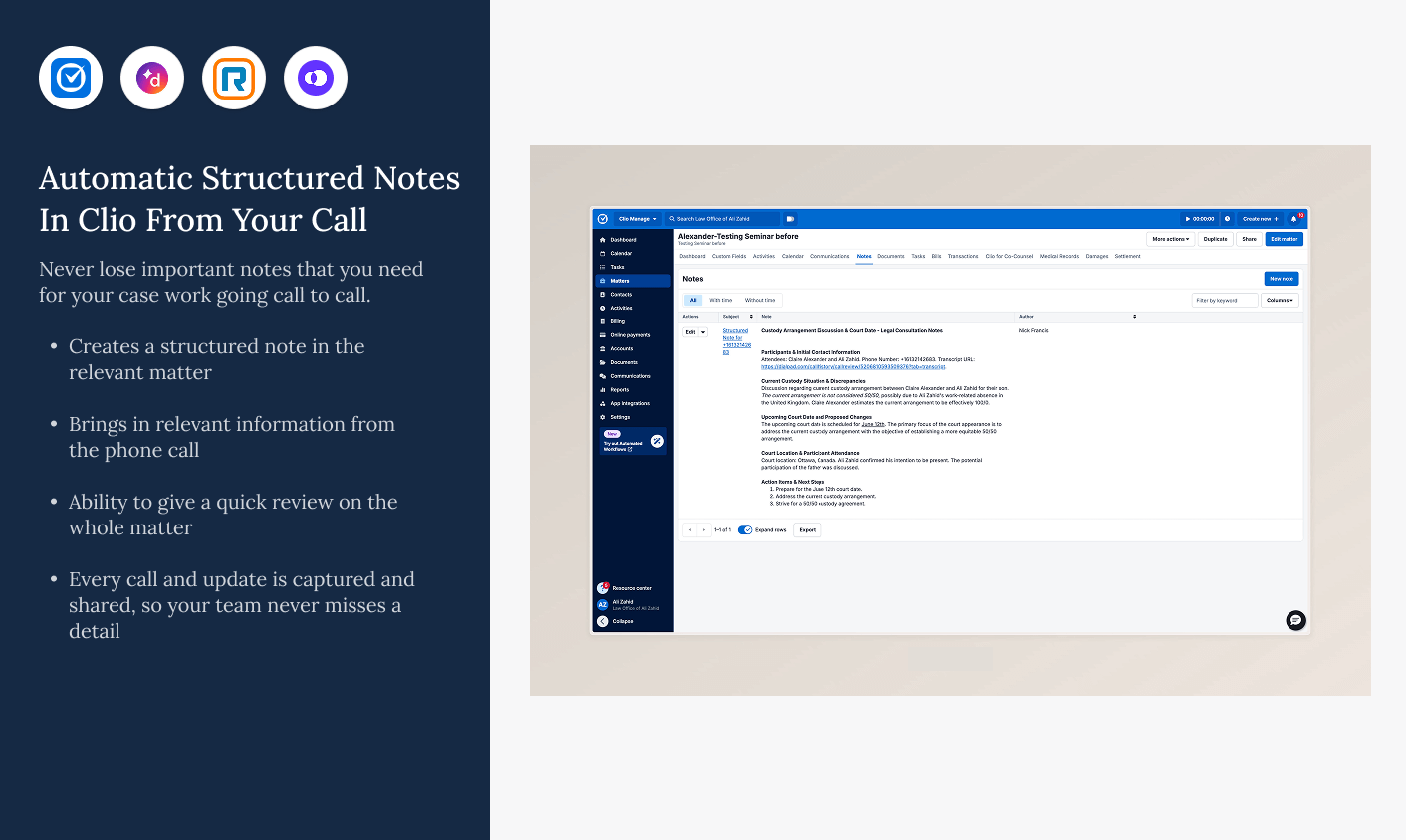 Syncs all your call-related info directly to the right client and matter in Clio, so it’s there when you need it.