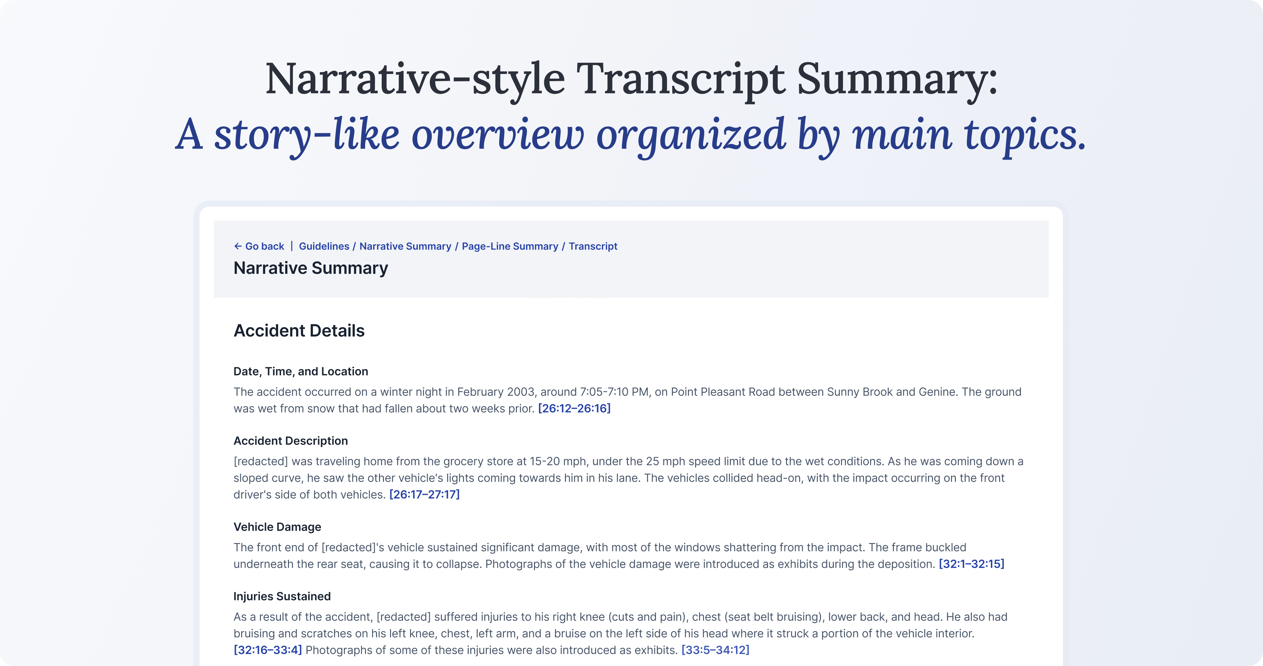 Eliminate the tedious task of manually sorting through deposition transcripts. Our custom-trained AI identifies key points, themes, and relevant details, providing a clear and concise summary. -