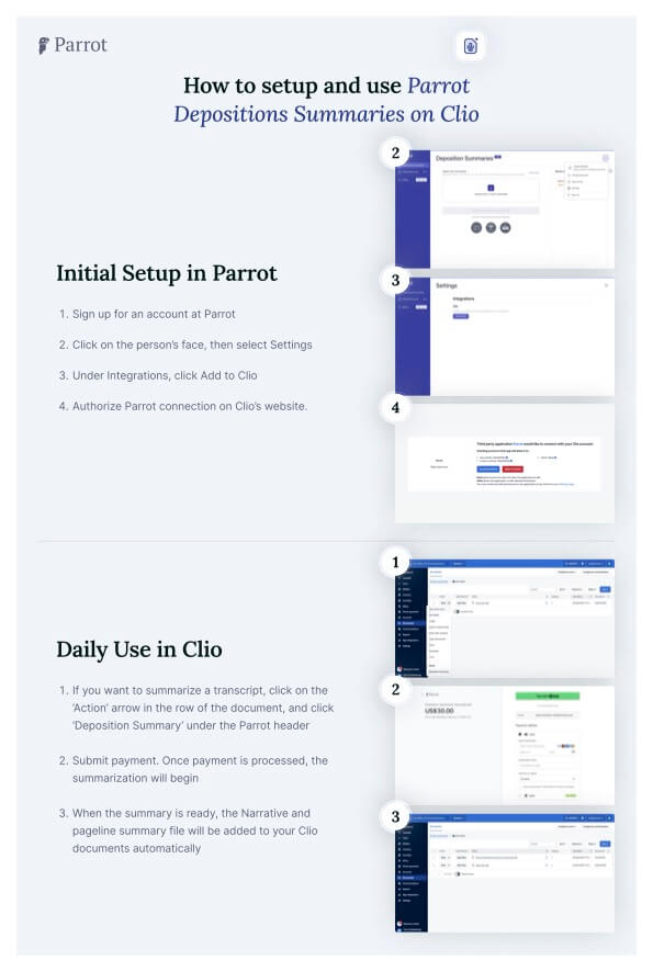Ready to improve your workflow with Parrot Deposition Summaries and Clio? Get Started