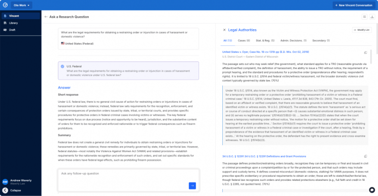 With Clio Work, you go beyond generic chatbots and use AI that understands the context of your matters and delivers precise, cited legal research, analysis, and drafting that moves your cases forward.