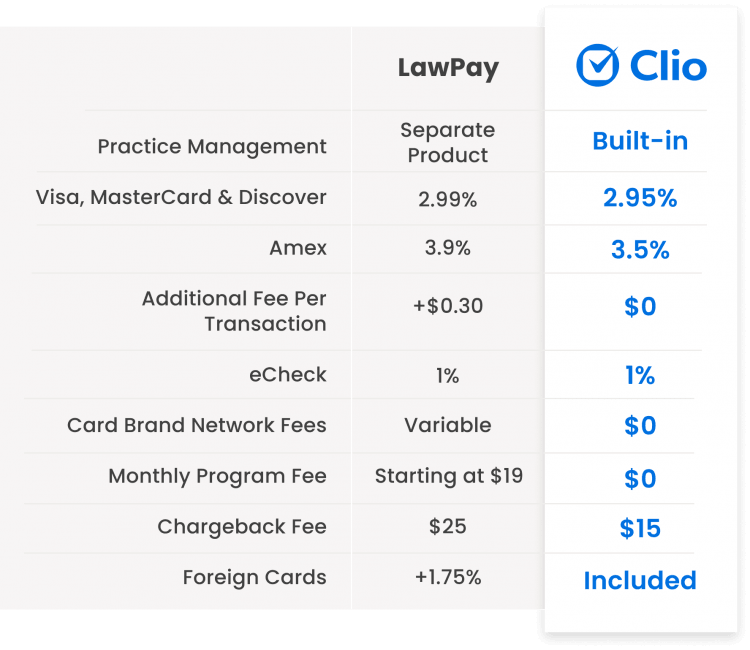 *Firms switching from the LawPay Integration to Clio Payments qualify for a 3.5% American Express processing fee.