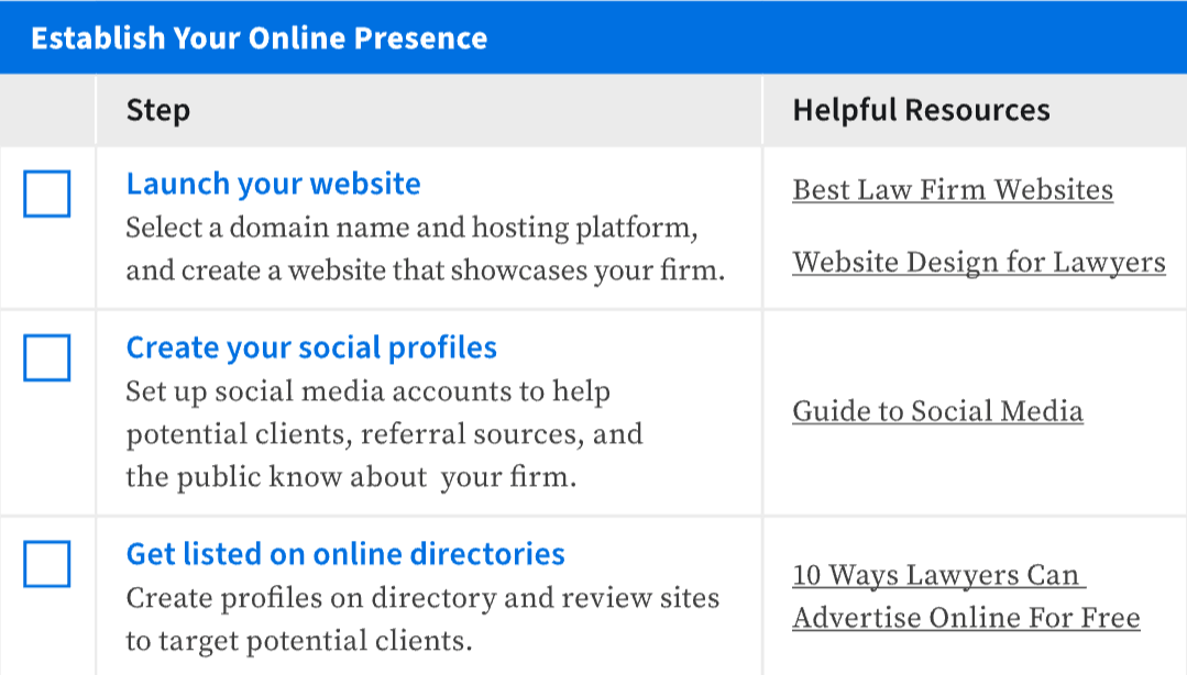 Everything you need to successfully start a law firm, including how to: