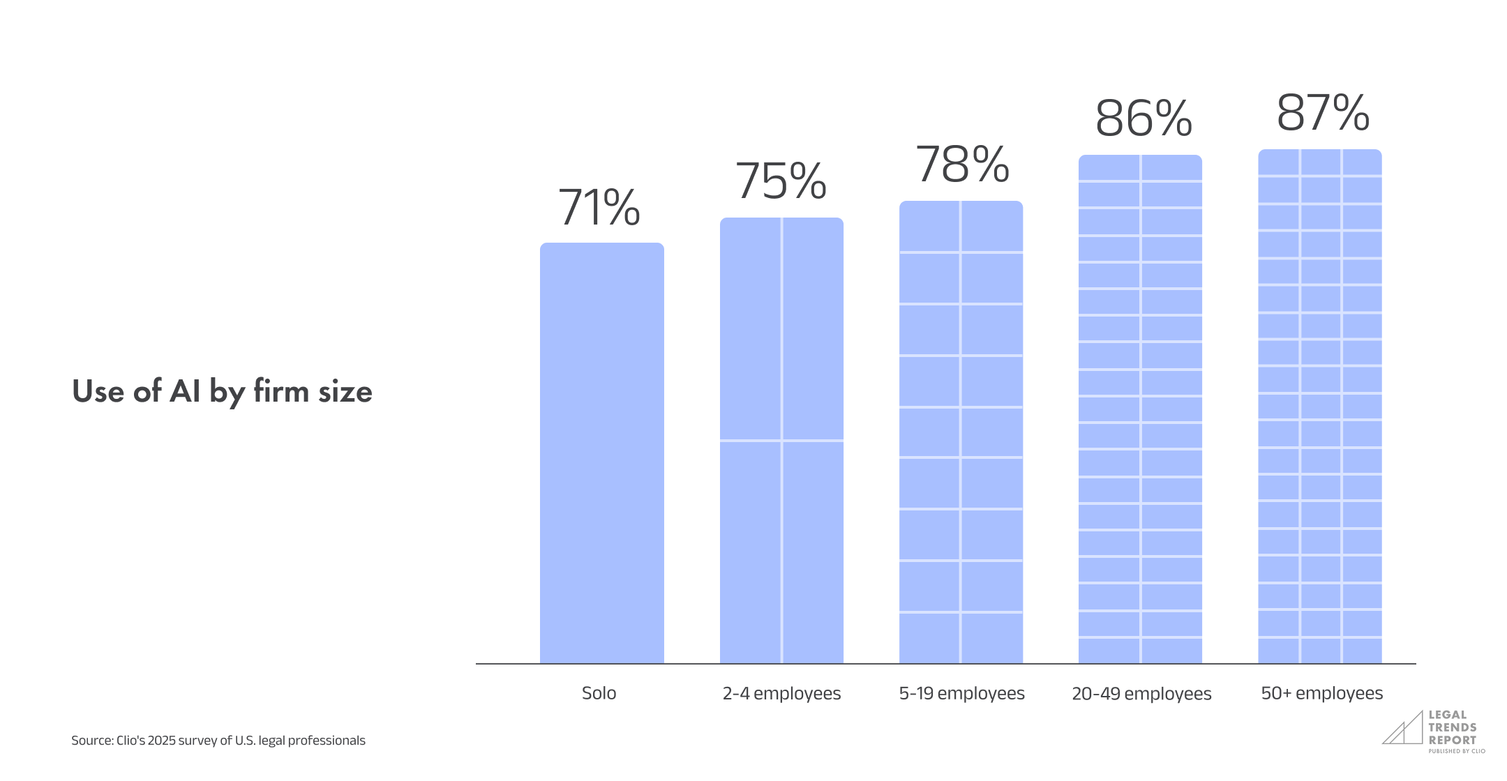 Pricing models will evolve as well. The Legal Trends Report found that 59% of firms now use flat fees either exclusively or alongside hourly rates, a significant departure from traditional billing. Among firms with wide AI adoption, 45% have already adjusted their pricing structures.