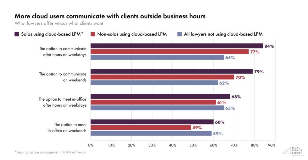 Of those using cloud-based LPM software, solos are also more likely than non-solos to communicate with clients on weekends and after hours—and they are less likely to work more than 40 hours per week.