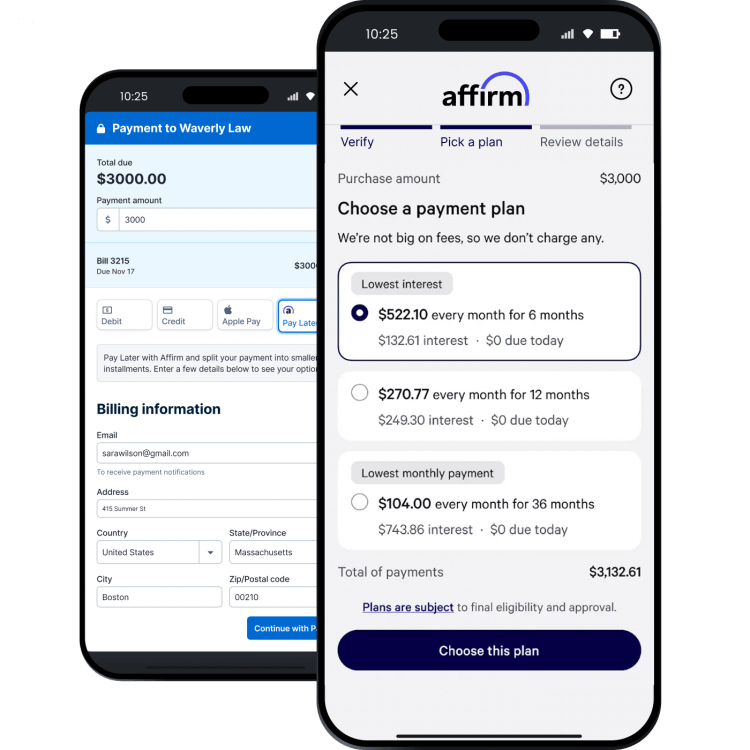 Pay Later is a financing solution by Affirm that lets you pay your legal fees in smaller, scheduled installments while law firms get paid the full amount upfront.